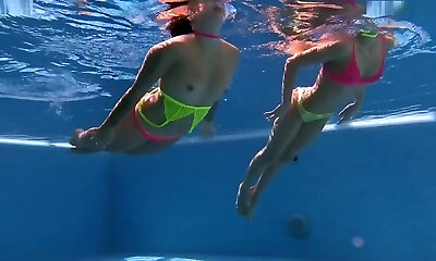 Classy Russian lesbian teenage enjoying swimming in the pool