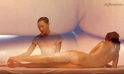 无辜的处女青少年Fekla Holopova是害羞与她的按摩师